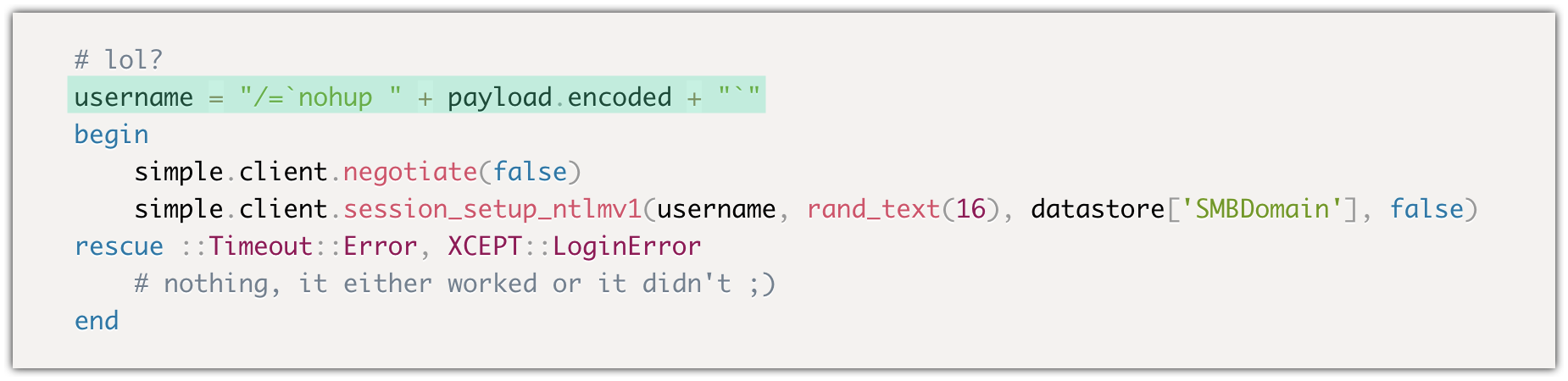 直接網搜:kaliamba smbd 3.0.20,就會在exploit-db找到Metasploit腳本,移至腳本最下方得知RCE方法與使用者帳號有關。