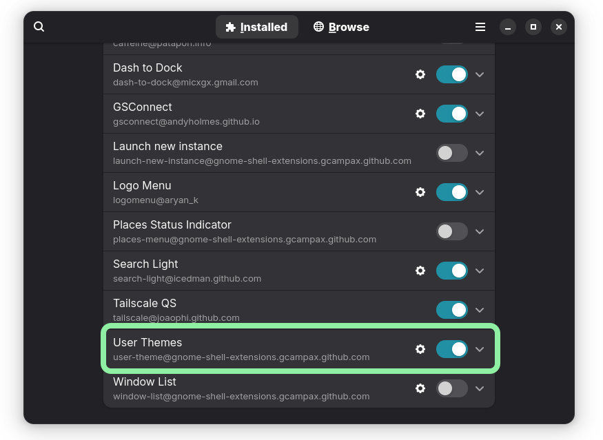 Extension Manager,向下捲啟動「User Themes」