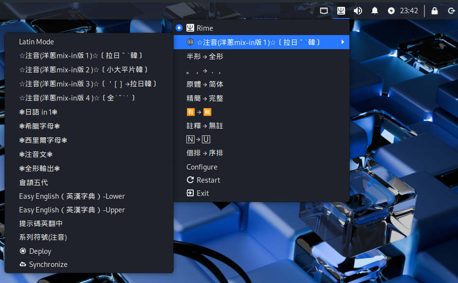 自從開始全天Linux,或是更正確的說,自從開始用電腦那天起,我就一直被沒有適合的多語言輸入法困擾著, 直到發現Rime和洋蔥輸入方案(法),一試成主顧,任何經手的系統必安裝這套組合拳,因為…